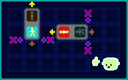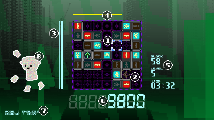 ■■操作方法 各ボタン、キーの役割を覚えましょう ゲームパッド使用時 方向キー: カーソル移動、項目の選択 1ボタン: 押しっぱなしでブロックをホールド、決定 2ボタン: ショック(メーター満タン時)、キャンセル LRボタン、LRトリガー: ブロック追加 スタートボタン : ポーズ ※ゲームパッド使用時のホールド&決定ボタンとショック&キャンセルボタンの割り当ては、オプションで変更できます。 キーボード使用時 矢印キー、WASDキー: カーソル移動、項目の選択 SPACE、ENTER、Z、Jキー: 押しっぱなしでブロックをホールド、決定 X,Kキー: ショック(メーター満タン時)、キャンセル C、Lキー : ブロック追加 Pキー : ポーズ その他の特殊操作 ESCキー : タイトル画面で押すとゲームを終了します。 上に戻る ■■基本ルール カーソルの扱い方、ブロックの移動可能な方向、ブロックを破壊する方法を覚えましょう ボード上に出現する信号機を模したブロックを破壊してスコアを稼ぐ、アクションパズルゲームです。 方向キーを入力するとカーソルが上下左右に移動します。 カーソルをブロックの上に合わせた状態でホールド(決定)ボタンを押しっぱなしにすると、ブロックをホールドします。 ブロックをホールドした状態で方向キーを入力すると、ブロックも一緒に移動させることができます。 出現するブロックは主に「シグナルブロック」と「アローブロック」の2種類が存在します。 ブロックの種類で移動方向と破壊方法が異なるので、しっかりと覚えましょう。 シグナルブロック
