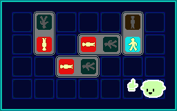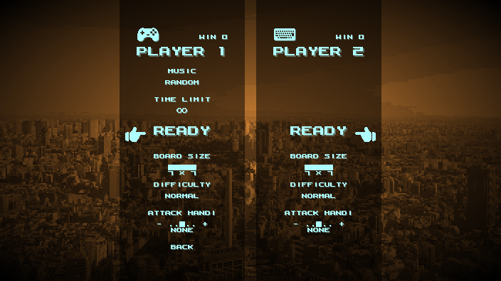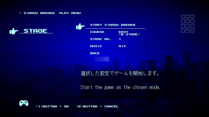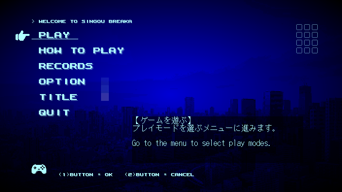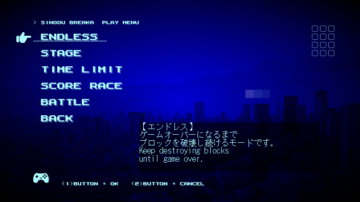 上に戻る ■■「ショック」について 危険な局面に遭遇した時のために、ショックの使い方を覚えましょう ボードの横に表示されているバッテリーメーターが満タンの時に、「ショック」が使用可能となります。 カーソルをブロックに合わせた状態でショックボタン(2ボタン,Xキー,Kキー)を押すと、カーソル下のブロックにショックを与えます。 ショックを使用するとバッテリーメーターは0になります。 ブロックの種類によって、ショックを与えた際の挙動が異なります。 シグナルブロックにショックを与えた場合、シグナルの点灯色が強制的に切り替わります。 アローブロックにショックを与えた場合、表示されている矢印の向きが反対方向に変化します。(例:↑にショックを与えると↓に変化) ショックは、使用する度にバッテリーに負荷がかかります。 そのため、ショックを使用する度にバッテリーメーターの充電速度が低下するほか、スコアから500点が減点されます。 ショックの乱用には気を付けましょう。 上に戻る ■■特殊なブロック 稀に出現する特殊ブロックの性質を覚えましょう ![]() レーザースフィア ホールドして方向キーを入力すると、その方向にレーザーを発射し、レーザースフィア自体は消滅します。 レーザーが貫通したブロックはすべて破壊されます。 ENDLESS、TIME LIMITモードでレベルが特定の数値に達した時などに出現します。 ![]() クロスサインブロック ホールドすることで上下左右に自由に移動させることができます。 このブロックは、レーザースフィアのレーザーで貫通する方法以外では破壊することができません。 ENDLESS、TIME LIMITモードでレベルが特定の数値に達した時や、STAGEモードの特定のステージなどに出現します。 上に戻る ■■ゲームの始め方 最初に表示されるメニューの項目を理解しましょう ![]() タイトル画面でゲームパッドのボタンかSPACE、ENTER、Z、Jキーを押すとメインメニュー画面に移ります。 (初回プレイ時または体験版では、言語選択画面のあと自動的にTRIAL LESSONモードが起動します) この時にボタンを押したゲームパッドまたはキーボードが、メニュー及びゲーム内での操作に使用する入力デバイスになります。 入力デバイスを切り替えるときは、メインメニューでTITLEを選択してタイトル画面に戻り、再度メインメニュー画面に移りましょう。 メニュー画面では方向キー(矢印キー、WASDキー)で項目を選択し、決定ボタン(SPACE、ENTER、Z、Jキー)で項目を決定します。 メインメニュー項目について PLAY プレイするモードを選択するメニューに移ります。詳しくはプレイメニュー画面を参照 HOW TO PLAY シンゴウブレイカの基本ルールと特殊なルールについての説明を閲覧できます。 RECORDS ゲームのスコアランキングなどの記録を閲覧できます。 OPTION 表示言語、ボタン設定、サウンド音量等の調整を行います。 TITLE 選択するとタイトル画面に戻ります。入力デバイスを変更したいときは一度タイトル画面に戻りましょう。 QUIT 選択するとシンゴウブレイカのアプリケーションを終了します。 上に戻る ■■プレイメニュー画面 自分の希望する設定のゲームをスムーズに開始できるようになりましょう ![]() メインメニュー画面でPLAYを選択すると、プレイするモードを選択するメニュー画面に移ります。 ENDLESS ゲームオーバーになるまでにブロックを破壊し、獲得スコアを競うモードです。 STAGE ノルマ数分のブロックを破壊し、ステージをクリアしていくモードです。 TIME LIMIT 設定された制限時間内に獲得したスコアを競うモードです。 SCORE RACE 設定された目標スコアに到達するまでの時間を競うモードです。 BATTLE 2人での対戦を行うモードです。 ![]() モードを選択すると、コースやBGMなどを設定してゲームを開始するためのサブメニュー画面に移ります。 各項目で左右キーを入力して、コースなどを選択します。 START SINGOU BREAKA 下の項目で選択した設定を確定し、ゲームを開始します。 COURSE プレイするコースを選択します。コースによって難易度が変化します。 EASYが最も難度が低く、順にNORMAL、HARDと難度が高くなります。 STAGE NO. (STAGEモードのみ) 開始時のステージ番号を選択します。 ただしコースごとに一度プレイしたことのあるステージ番号までしか選択できません。 MUSIC プレイ中に再生されるBGMを選択します。 OFFに設定するとBGMは再生されません。MIXに設定するとゲーム状況に応じてBGMが切り替わります。 A ~ D-TYPEを選択して決定ボタンを押すと、選択したBGMを試聴することができます。 上に戻る ■■各プレイモードの説明 モード毎に異なるルールを覚えましょう ■ENDLESS ゲームオーバーになるまでにより多くのブロックを破壊し、獲得したスコアを競うモードです。 設定したコースにより、ゲーム開始時のレベルが変化します。 ブロックを10個破壊するごとにレベルが1上昇し、ブロックの同時出現数や出現スピードなどが変化します。 (レーザースフィアで破壊したブロ